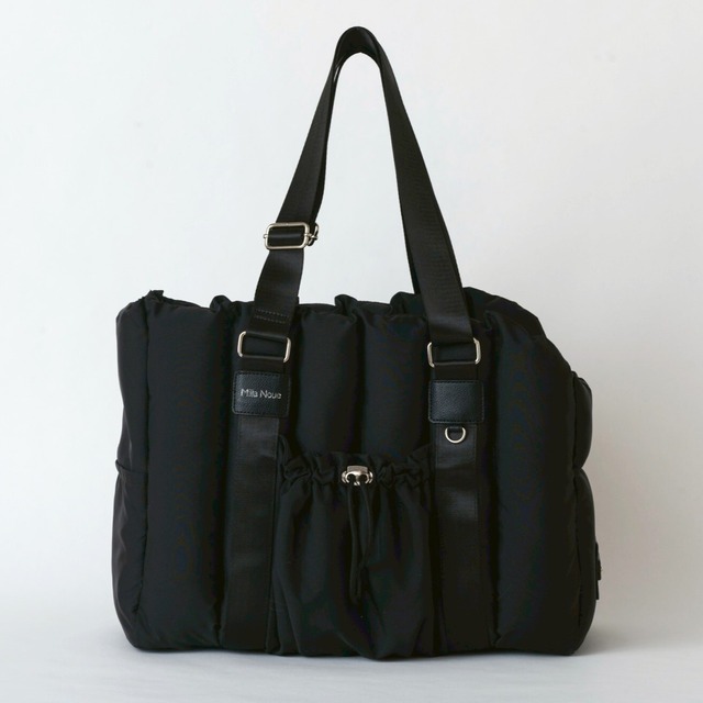 CONCEPT 毎日のお散歩は、 パートナーと過ごすかけがえのない時間。 けれど実際には、 マナー袋やマナーボトル、おやつ、カフェマットなど、 持ち歩くものは意外と多いものです。 必要なものをきちんと持ち運びながら、 日常の装いにも自然に馴染むバッグがあったら。 そんな想いから このバッグは生まれました。 身体にやさしく沿う軽やかな素材。 整理しやすいポケット設計。 外出先でもくつろげるカフェマット。 そして、どんなスタイリングにも馴染む シンプルで落ち着いたデザイン。 お散歩の時間が、 ほんの少し心地よくなるように。 MillaNoueは パートナーと過ごす日常を 静かに支えます。 商品説明 パートナーとの日常を、より心地よく。 Milla Walk Toteは お散歩はもちろん、デイリーにも自然に馴染む 大人のためのウォークバッグです。 パートナーとの時間に必要なものを すっきりと持ち運べるよう設計しました。 多くのオーナー様の声をもとに 使いやすさと美しさのバランスを考えて仕上げています。 台形シルエットのデザインにより バッグの口元が大きく開き、 荷物の出し入れもスムーズ。 コンパクトな見た目ながら お散歩や外出に必要なアイテムを しっかり収納できる設計です。 内側には 500mlのペットボトルを縦に2本収納できる ボトルポケットを配置。 巾着仕様のポケット内側には アルミ素材を使用しているため 保冷効果があり、暑い季節でも パートナーのお水を冷たいまま持ち運ぶことができます。 さらに、撥水素材の裏地には マナー袋やおやつ、スマートフォンなどを 整理して収納できるポケットを配置。 MillaNoueらしい やわらかなパフフォルムを活かしながら、 同系色のハンドルを合わせることで 日常のスタイリングにも自然に馴染む 落ち着いたデザインに仕上げました。 本体は軽量設計で 身体にやさしく沿うため、 長時間のお散歩やお出かけでも快適にお使いいただけます。 表地・裏地ともに撥水素材を使用しており 雨の日のお散歩やマナーボトルの水滴なども 気にせずお使いいただけます。 さらに、お散歩先で便利な キルティングのカフェマットをセット。 カフェや外出先でも さっと取り出して パートナーと心地よい時間を過ごすことができます。 付属のショルダーストラップを使用すれば 斜め掛けも可能。 両手を空けたいシーンでも 快適に持ち歩くことができます。 日常のお散歩から ちょっとしたお出かけまで。 大人のライフスタイルに 自然と寄り添うトートバッグです。 FEATURES ① 軽やかな使い心地 軽量設計のポリエステル素材を使用。 クッション性のあるやわらかな生地が 身体にやさしくフィットします。 ② 安心のファスナー仕様 口元はファスナー仕様。 電車や人混みなどでも 中身が見えにくく安心してお使いいただけます。 ③ 見た目以上の収納力 台形シルエットにより口元が広く開き、 見た目以上の収納力を実現。 ④ 整理しやすい8つのポケット 内側3つ・ボトルポケット2つ・外側3つ 計8ポケットで整理しやすい設計。 ⑤ カフェマット付き 同素材のキルティングカフェマット付き。 外出先でもパートナーがくつろげる スペースをつくることができます。 ⑥ ショルダーストラップ付き 斜め掛けも可能。 両手を空けたいシーンでも便利です。 ⑦ 撥水素材を使用 表地・裏地・カフェマットすべてに 撥水素材を使用しています。 ※完全防水ではありません。 ⑧ シリーズコーディネート可能 MillaNoueキャリーバッグと 同素材で統一。 シリーズで揃えることで 統一感のあるスタイルを楽しめます。 ⑨ 消臭ネームタグ付き 消臭機能糸を使用したネームタグを採用。 バッグ内の気になるニオイを軽減します。 RECOMMEND こんな方におすすめ ・お散歩に必要なものを整理しながら持ち歩きたい方 ・カフェや外出先に立ち寄ることが多い方 ・日常の装いにも馴染む上品なお散歩バッグをお探しの方 ・お散歩だけでなくデイリーにも使えるバッグをお求めの方 COLOR ブラック SIZE 本体:W21.5(上部37.0)×H23.0×D15.5 持ち手全長:41.0 ショルダー全長:75cm~120cm ショルダー幅:4cm 外ポケット:3 内ポケット:3+ペットボトルポケット2 マット:W50.0×H35.0 WEIGHT 本体:420g マット:85g ショルダー:90g MATERIAL 本体:ポリエステル 裏地:ポリエステル マット:ポリエステル CARE お手入れ方法 Bag ・汚れた場合は柔らかい布で優しく拭き取ってください。 Mat ・マットは、手洗いでのお手入れが可能です。優しく手洗いしてください。 ・乾燥機の使用はお控えください。 ・形を整えて陰干ししてください。 ATTENTION パートナーと安心してお使いいただくために ・ご使用の際は首輪またはハーネスに飛び出し防止リードを装着してください。 ・ご使用前に破損やほつれがないかご確認ください。 ・長時間のご使用は、パートナーの様子を見ながらご使用ください。 ・高温になる場所や直射日光の当たる場所でのご使用はお控えください。 ・安全のため、必ず飼い主様の目の届く範囲でご使用ください。 ・撥水素
