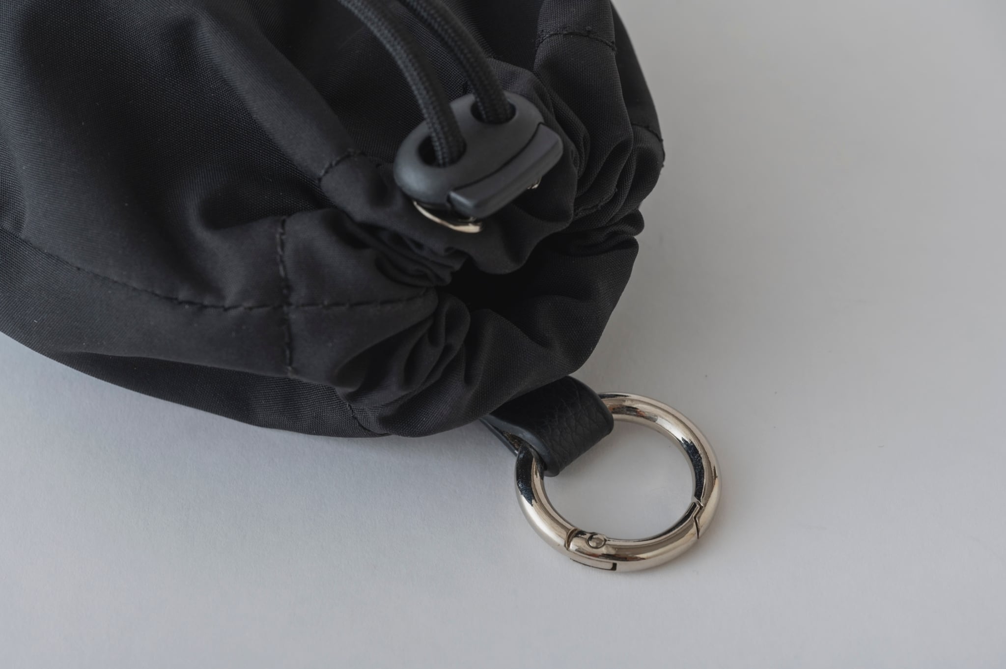 巾着の背面にはカラビナ付きで、バッグに装着して持ち運びもできるので