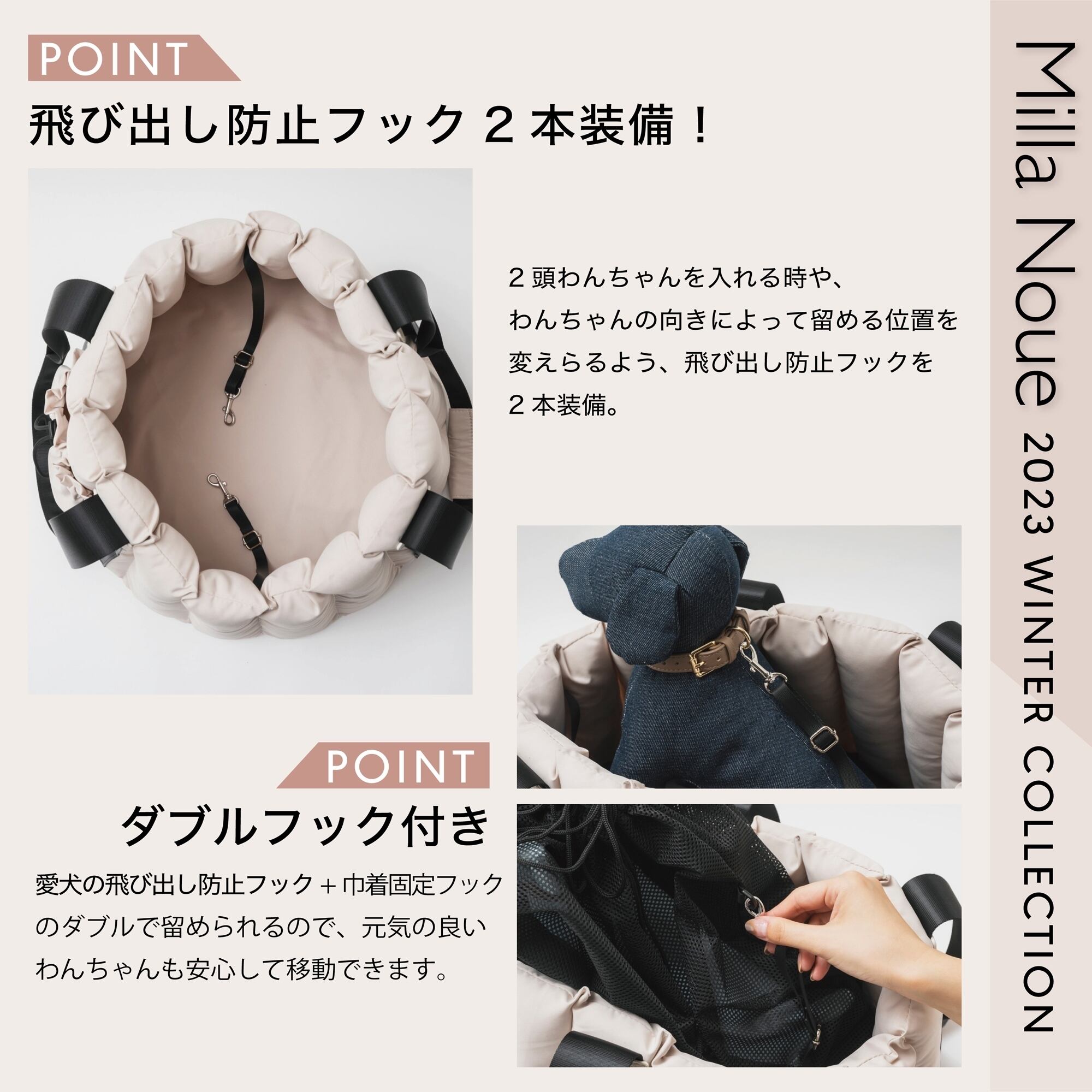 愛犬の飛び出し防止フック + 巾着固定フックのダブルで留められるので