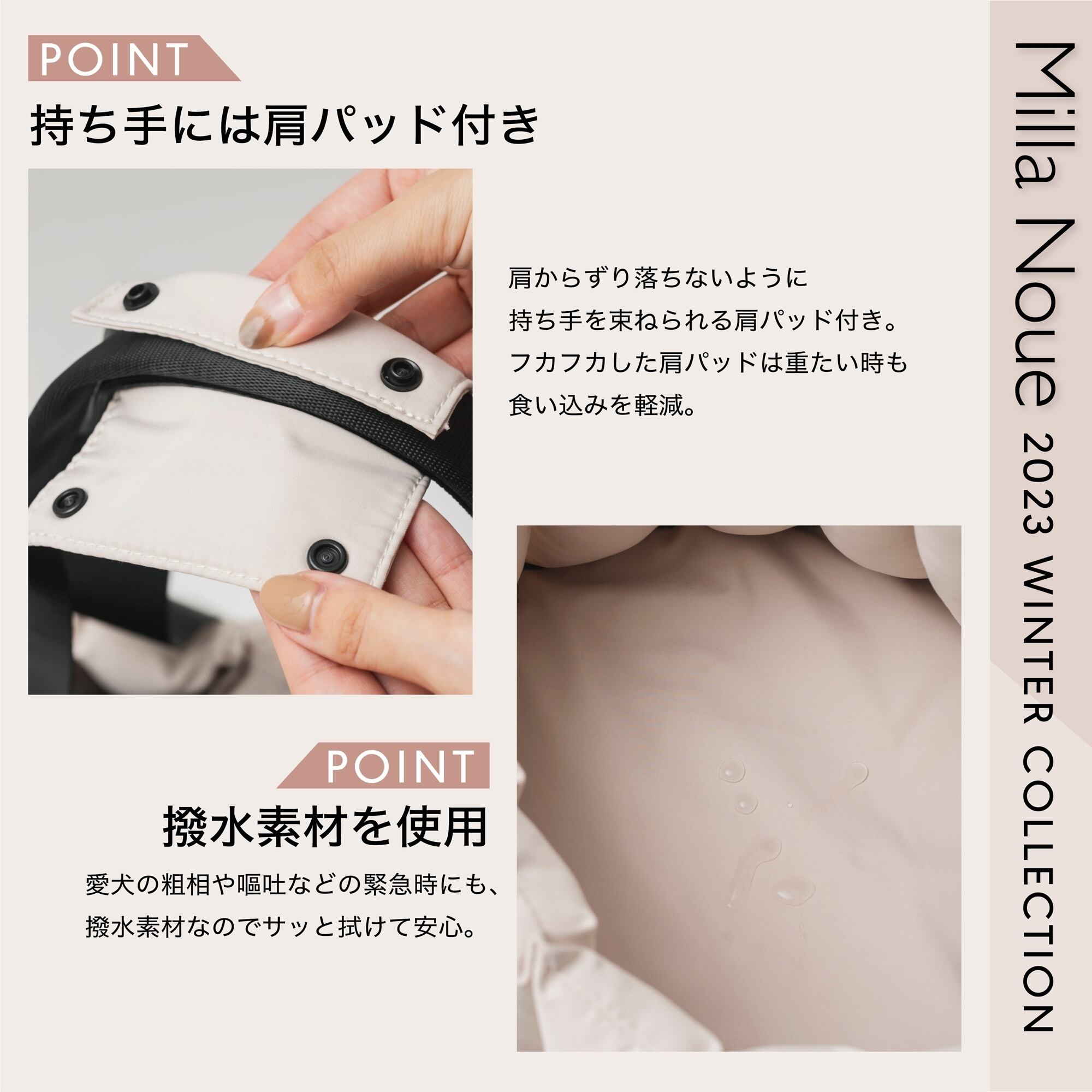 フワモコした肩パットは重たいときも食い込みを軽減。
